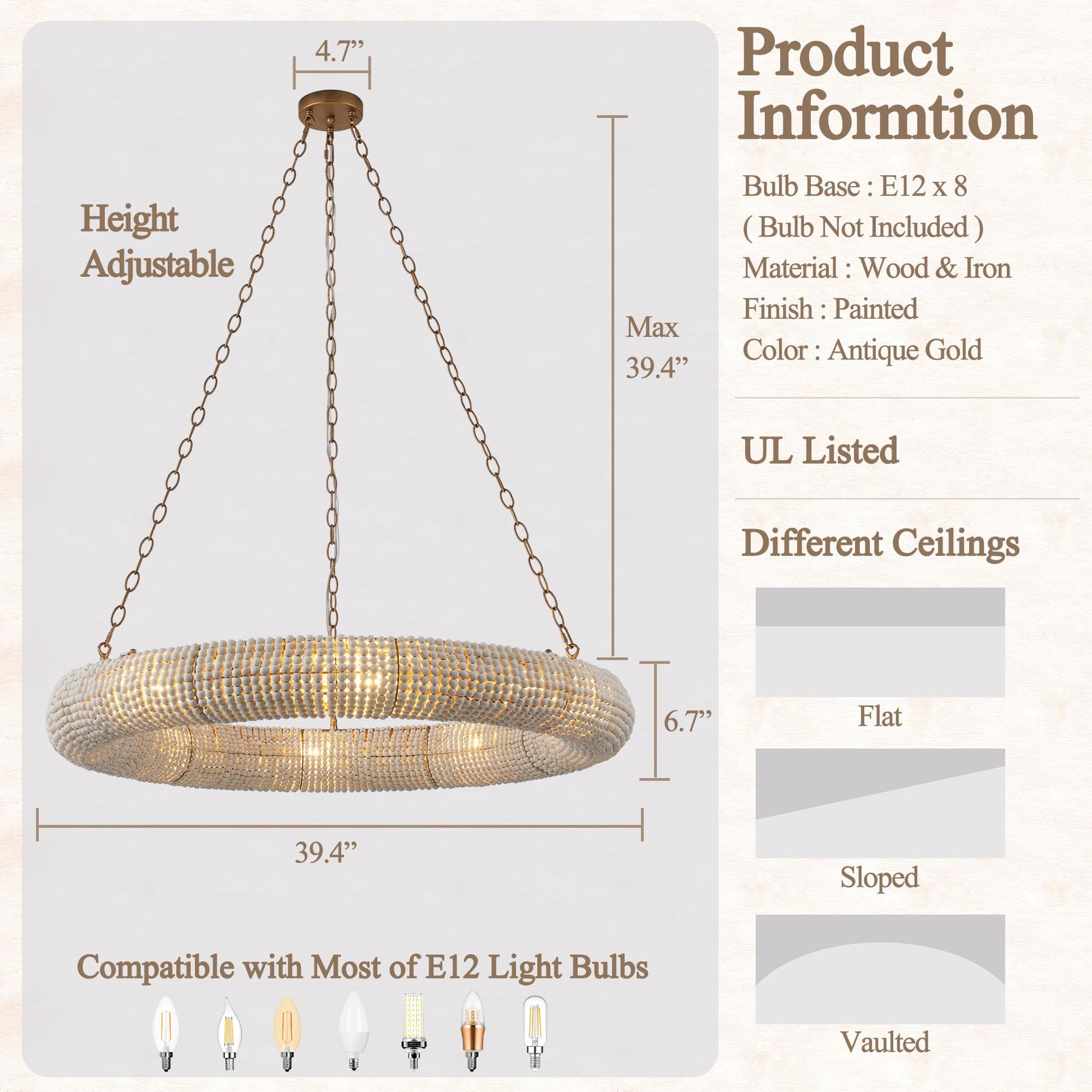 E12 Bulbs Required : This beaded chandelier works with 8 piece standard E12 base bulbs (Max 40W each), ensuring sufficient illumination for various spaces, and allowing you to choose bulbs to match your lighting preferences