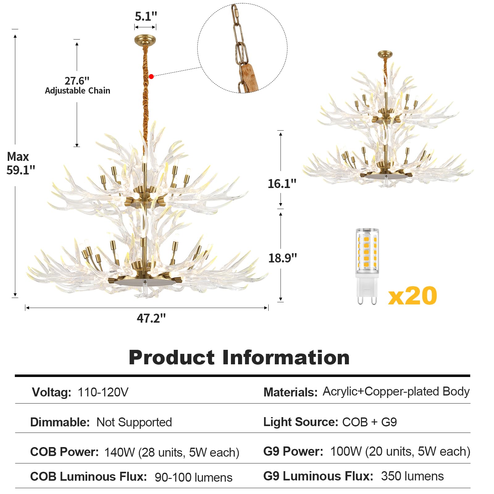 Dimensions & Tiers: Standing at a maximum height of 59.1 inches and a minimum height of 33.5 inches by adjusting the chain, this double-tier acrylic deer horn chandelier spans 47.2 inches in width, making it an excellent statement piece that matches a variety of spaces
