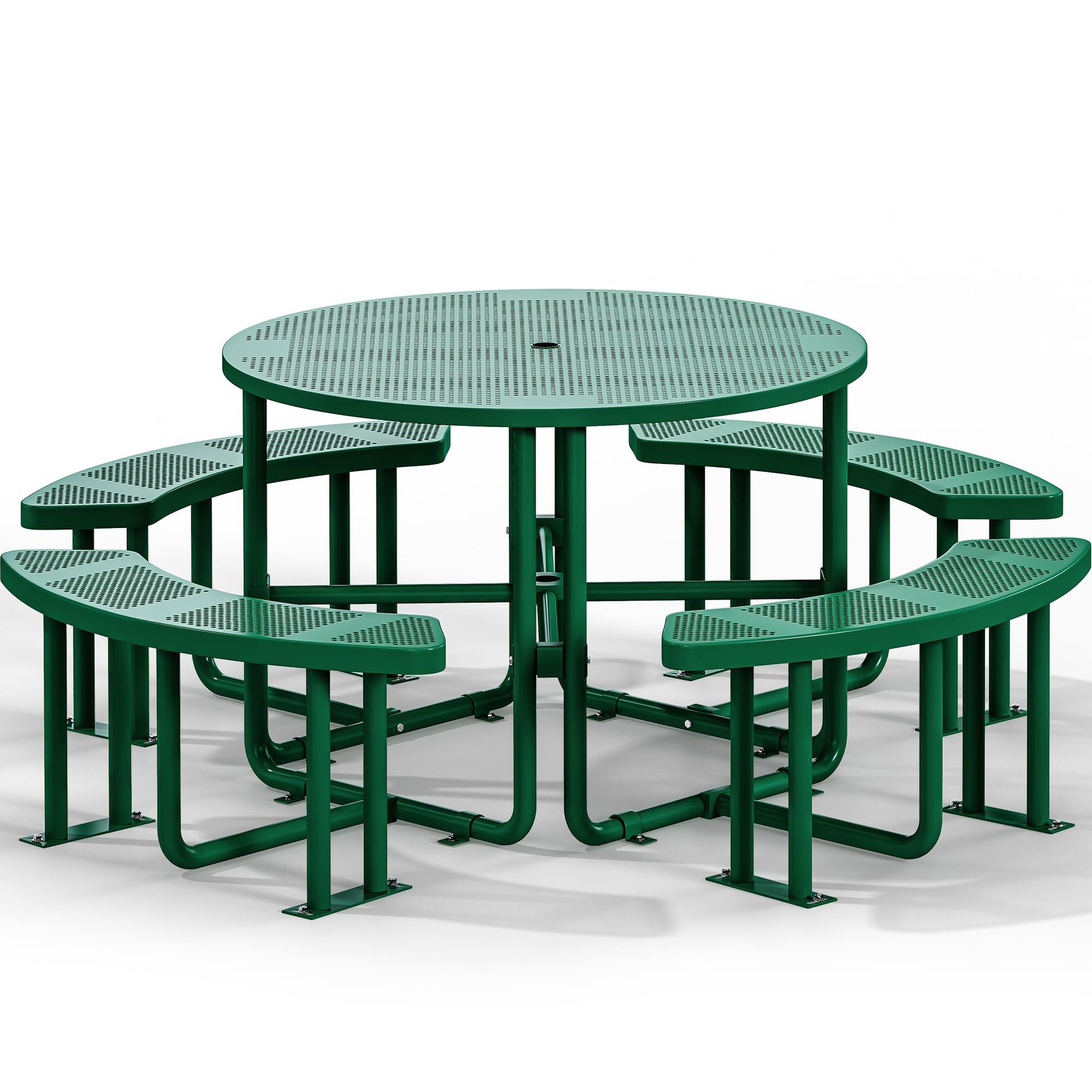 Built for Commercial Use: This round picnic table features a reinforced steel frame with 5-weld reinforcement and independent leg support, holding up to 1100 lbs on the tabletop and 265 lbs per bench; The detachable benches and 30" under-table clearance meet ADA compliance